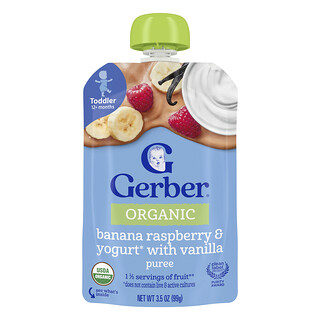 גרבר מחית בננה פטל ויוגורט 12+ חודשים – 99 גרםגרבר מחית בננה פטל ויוגורט 12+ חודשים – 99 גרם