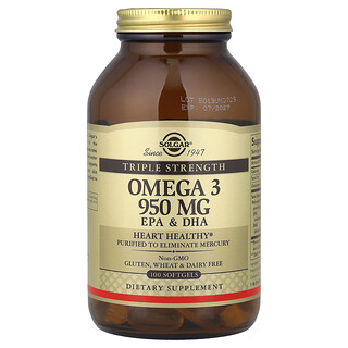 סולגאר אומגה 3 EPA & DHA – עוצמה משולשת 950 מ"ג – 100 כמוסות רכות הוא תוסף תזונה איכותי מבית סולגאר, המכיל ריכוז גבוה של חומצות שומן חיוניות מסוג אומגה 3. כל כמוסה רכה מכילה 950 מ"ג של אומגה 3, המורכבת בעיקר מ-EPA ו-DHA, המסייעות לתפקוד תקין של הגוף.