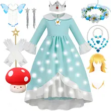 שמלת הנסיכה רוזלינה גלקסי עם אור זוהר היא תחפושת מהנה וקסומה לילדות, המושלמת למשחק תפקידים, מסיבות תחפושות וליל כל הקדושים. השמלה מעוצבת בהשראת דמותה של רוזלינה ממשחקי וידאו, וכוללת צבעים כחולים עמוקים, סגולים וטורקיז, המזכירים את הגלקסיה. קישוטים כוכביים ופרטים נוצצים מעטרים את השמלה, ומדגישים את המראה הקוסמי. תאורת LED מובנית מוסיפה אלמנט של קסם, כאשר הכוכבים הקטנים בשמלה זוהרים באור רך ונעים, מה שמבטיח שהילדה תהיה הכוכב של האירוע.