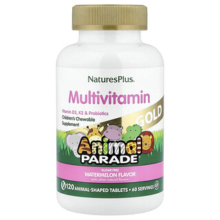 הכירו את Animal Parade® Gold של NaturesPlus, תוסף תזונה מולטי ויטמין לעיסתי לילדים בצורת חיות חמודות בטעם אבטיח מרענן! המוצר מכיל 120 טבליות במארז, ומעניק לילדכם חוויית נטילת ויטמינים מהנה וטעימה.