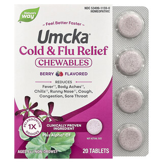 הקלה טבעית ומהירה לתסמיני הצטננות ושפעת עם Umcka טבליות מציצה להקלה על הצטננות ושפעת של Nature's Way. מיועדות לילדים מגיל 6 ומעלה, הטבליות בטעם ברי משובח מספקות הקלה יעילה מ: נזלת, שיעול, כאבי גרון וגודש באף. הפורמולה מכילה תמצית ייחודית של צמח ה-Pelargonium sidoides, הידועה ביכולתה לתמוך במערכת החיסונית ולהקל על תסמיני הצטננות ושפעת.